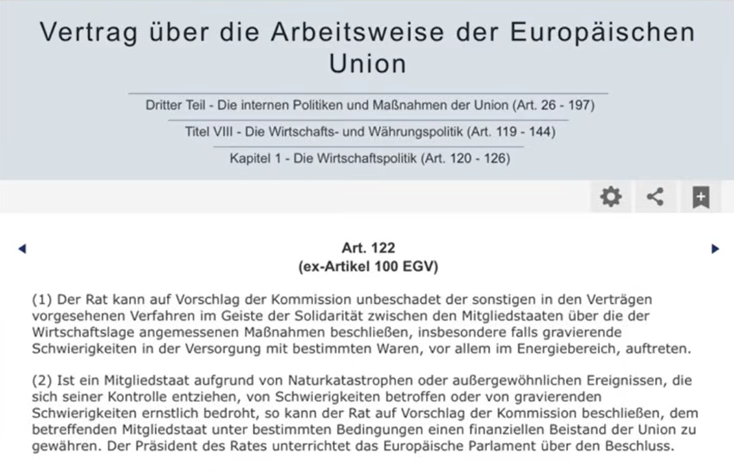 Die Europäische Union plant die Ausrufung des "Notstands" über den Art. 122, wie im beigefügten Bild zu sehen ist. Diese Vorschrift gilt allerdings nur für Mitgliedsstaaten, also nicht für die Ukranine. Wir dürfen auf die Begründung gespannt sein.